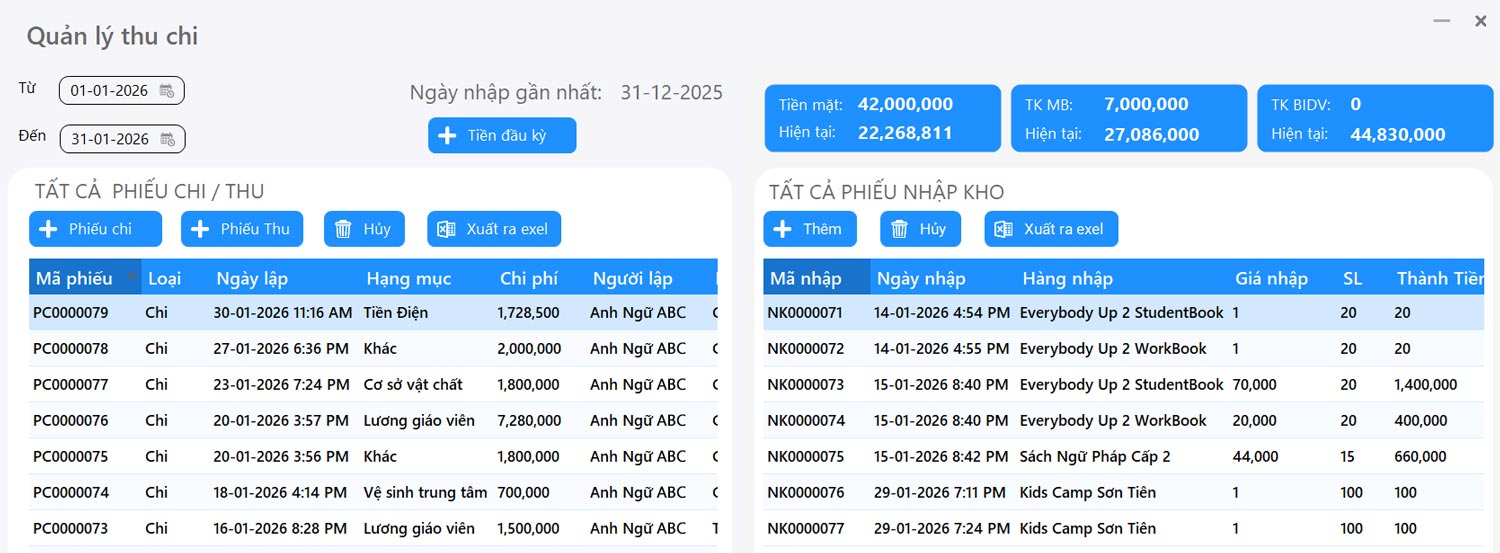 Theo dõi nhập xuất tồn đồng phục, giáo trình, đồ dùng học tập.