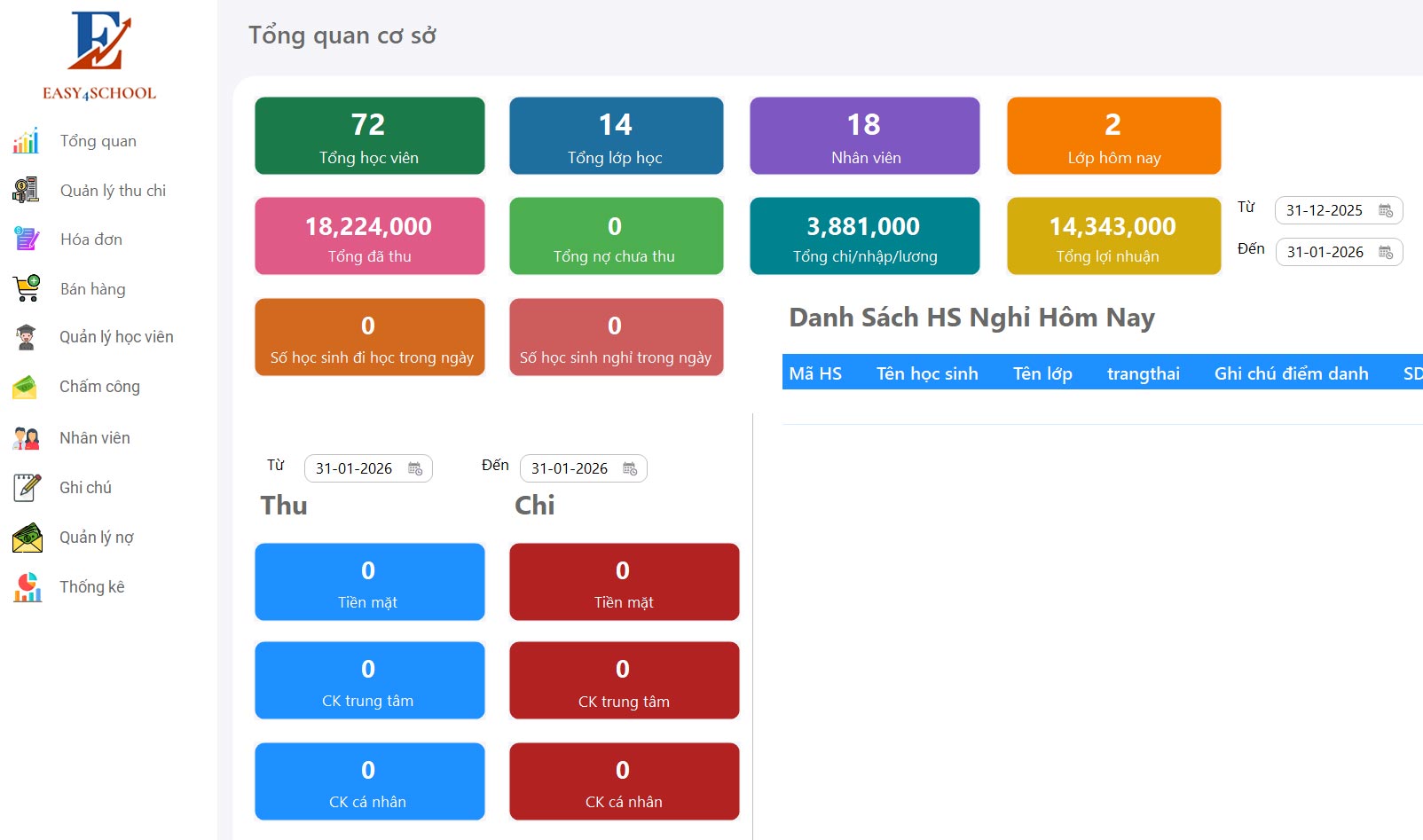 Điểm danh, sắp lịch học, quản lý hồ sơ học viên chi tiết.