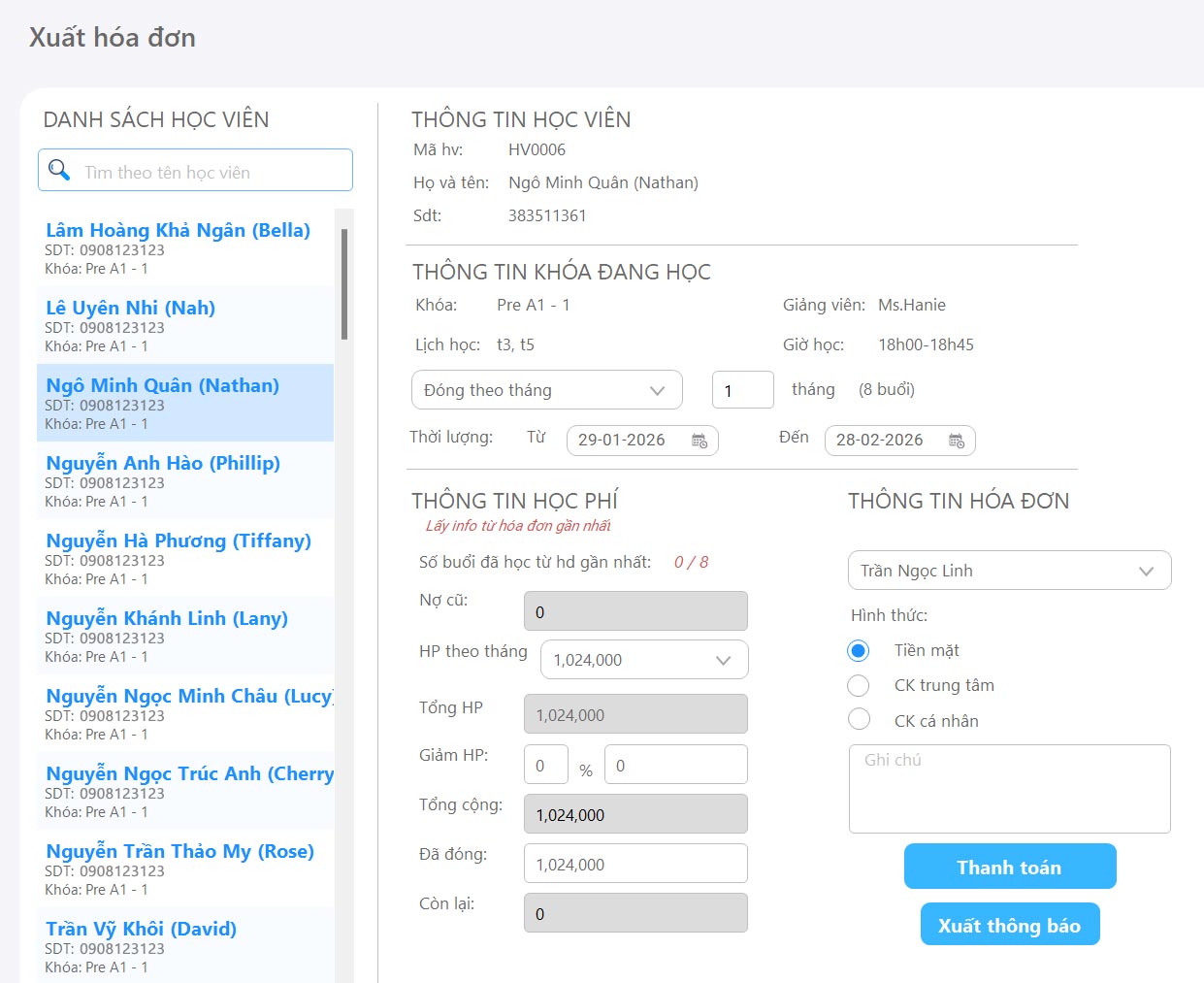 Xuất hóa đơn, thông báo học phí hàng loạt để gửi qua Zalo cho phụ huynh.